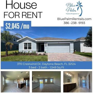 This beautiful home is the Adeline model in the desirable Eagle Crest community. This house features 3 bedrooms, 2 bathrooms & an attached 2-car garage. The home has a welcoming front porch where you walk into an inviting foyer area. The open floor plan connects the beautiful kitchen that features a large island to the open and bright living & dining area. The Master bedroom has a dedicated dual vanity bath and an expansive walk-in closet. The house is carpeted throughout and has tile in the kitchen, baths and foyer. There are updated fixtures & ceiling fans operated by remote. This back of the home features a view of the pond. Lawn is tenant responsibility or can be included in rent with additional fee. All utilities are tenant responsibility. The community features a playground, dog park , nature views & walking trails that lead to a hidden lake. All near World Famous Daytona Beach. Easy access to I-4 & LPGA Blvd
