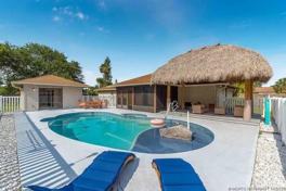 This pool home boasts a prime location, merely 15 minutes from public beaches and 10 minutes from Jensen Beach and Stuart's downtown areas. The main residence has two bedrooms, two bathrooms, and a spacious two-car garage. A separate guest house, situated beside the pool, offers one bedroom, one bathroom, and the option to be furnished or unfurnished. Additional features include a heated pool, hot tub, tiki deck, two storage sheds, and a fully fenced yard.