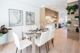 Executive 3 bedroom + flex room and roof top patio. Air conditioned town home w/ stylish interiors. Modern kitchen with quartz countertops, superior quality stainless/integrated appliances & Miele gas cooktop. Airy 9' ceilings on main floor, gas hook-up on patio & engineered hardwood flooring. Top floor master bedroom with spa-inspired ensuite and radiant flooring. EV charging plug in the parking spot, accessible directly from the townhouse. 240sqft of patio and deck.