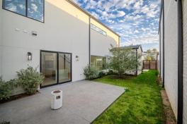 This lock and leave home boasts impressive features, including high ceilings and a chef's kitchen equipped with quartz countertops, ample storage, slab cabinets, and Bosch stainless steel appliances. The generously sized living and dining areas with 5-inch hardwood floors flow seamlessly onto a charming patio, thanks to a sliding door that enhances indoor-outdoor living.