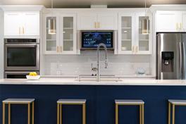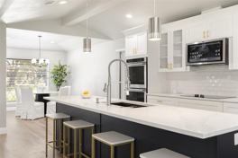 HOME FEATURES: Chef's dream kitchen with double oven and soft-close drawers, Taj Mahal quartzite waterfall countertops, engineered wood flooring, spacious secondary master suite, and smart home technology.