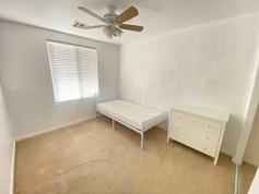 Smaller upstairs bedroom (approx. 10x12), fully furnished with bed, dresser, desk, and chair—ideal for someone looking for a simple, move-in ready space.