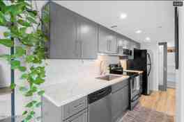 The updated kitchen boasts marble countertops, stainless steel appliances, and a walk-in pantry. All bathrooms feature floating vanities and contemporary fixtures.