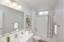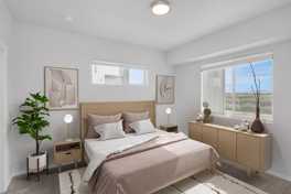 Apartment is equipped with full size washers and dryers, plush carpeted bedrooms, and warm engineered flooring in living areas.
