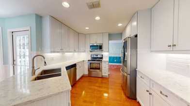 The kitchen is a chef's dream, boasting quartz countertops and stainless steel appliances, with a cozy breakfast nook just off the kitchen. The primary bedroom is generously sized, and the primary bath includes dual sinks, a jetted garden tub, and a walk-in shower. Upstairs, you'll find three additional guest bedrooms, a full-size guest bathroom, and a convenient laundry room equipped with a full-size washer and dryer.
