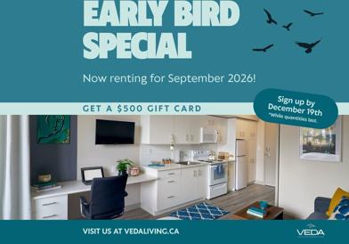 Exclusive Student Living: Single-occupancy, furnished studio suites just a 10-minute walk from UBCO. All-inclusive pricing covers utilities, internet, and furniture!Amenities Include:-Fitness centers-Game rooms with pool tables-Private study rooms-Laundry facilities-Movie room-Rooftop patio-And so much more!Community Vibes: Monthly events organized by our amazing ambassador team to keep you connected and engaged.**NOW RENTING FOR SEPTEMBER 2026! -Sign up by December 19th to receive a $500 gift card.*Looking for an earlier move-in? A few units are available for immediate occupancy and for January 1st, 2026. Ready to apply? Don't miss out—spaces are limited!