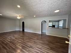 2 bedroom 2 bath home with large open concept living room and dining room. kitchen with range, fridge, and dishwasher. Laundry area. Hard surface flooring through out. one bath has a walk-in shower. Front Porch and large storage building. Window A/C and Space Heat. No Pets. Lawn Care provided.