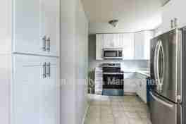 The heart of the home features a gourmet kitchen with ample cabinet space, pristine white cabinets adorned with stylish nickel hardware, and solid countertops providing plenty of workspaces. Stainless steel appliances, including a microwave, glass-top stove, dishwasher, and fridge, make cooking and cleaning a breeze.