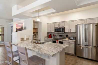 Beautifully remodeled first-level corner condo in prime location within gated Mirage Crossing. Enjoy added privacy with views of the greenbelt and lush landscaping, just steps from the pool and clubhouse. This immaculate home features upgraded cabinetry, marble countertops, and a mix of marble and laminate flooring. Open great room floor plan is tastefully furnished with split bedrooms, each with a TV - perfect for guests or short-term stays. Community amenities include a resort-style pool and spa, fitness center, billiards room, private dining area, and elegant clubhouse lounge. Excellent Scottsdale location close to shopping, dining, golf, and everything the area has to offer. Ideal for vacation living or temporary housing.