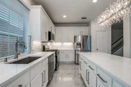 Fully remodeled, modern kitchen with white cabinetry, quartz countertops, oversized center island, and stainless steel appliances