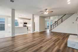 Luxury vinyl plank flooring throughout main living areas with plush carpet in bedrooms