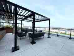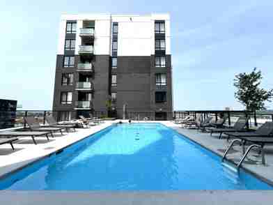 Amenities Galore: Luxurious building with multiple common rooms, an outdoor pool, and a patio with a BBQ area.