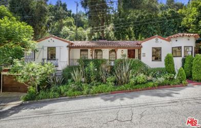 Available furnished or potentially unfurnished, Villa Gazelle, a Spanish colonial on a pretty street in Beachwood Canyon, tucked away on a quiet cul-de-sac off Canyon Drive, surrounded by lush grounds, secluded and private. 4+4.5, a light & airy living room with rows of windows looking over the canyon and front dozing porch, remodeled open kitchen w/ an eat-in breakfast nook overlooking greenery. Glass doors fold open to the grassy back yard for indoor/outdoor California dining & lifestyle. The main floor has 3 bedrooms w/ the primary having its own balcony plus two guest en-suites. A wall of glass and bookcases with a fireplace are hallmarks of the cozy library. Downstairs is a versatile artist studio that can be a bedroom w/ kitchenette, full bath and separate entrance. One car parking. This enchanting Spanish is a true vacation.