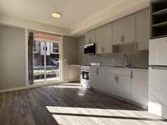 2nd floor, 321 sq/ ft. unit featuring modern finishes, a washer/ dryer, AC unit, and a private outdoor patio.