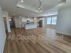 Inside features LVP flooring, granite countertops, shaker cabinets, tile backsplash, and modern lighting. The open layout includes a spacious kitchen with island and stainless appliances (gas stove, dishwasher, microwave, refrigerator) plus a living area with tray ceilings and TV mounts.