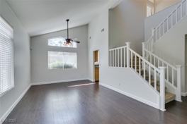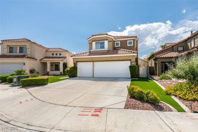 This gorgeous four-bedroom, three-car garage home is nestled in a gated community in Peccole Ranch. Located on a cul-de-sac street, it boasts freshly painted walls and vaulted ceilings throughout the downstairs. Laminate flooring covers the entire lower level. The kitchen features granite countertops and stainless steel appliances. The primary bedroom has a balcony, while the primary bathroom includes dual sinks, a separate tub, and a shower. The secondary bedrooms are generously sized. The nicely landscaped backyard features a covered patio with pavers and synthetic grass.