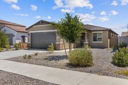 The backyard features a covered patio that overlooks a low-maintenance space with pavers and a bordered area of artificial lawn, complemented by accent plantings along the fence. This home is located in a brand-new community with excellent freeway access and nearby shopping and dining options.