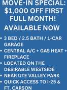 Discover comfort and convenience in this spacious 3-bedroom, 2.5-bath condo located at 6925 Yellowpine Dr, offering over 1,740 sq ft of well-designed living space. With immediate move-in available and a $1,000 rent credit, this is the perfect opportunity to settle into a westside gem.