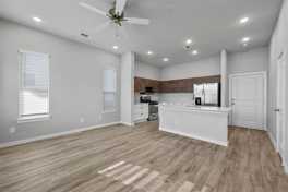 Step inside and be greeted by a modern gray-and-white kitchen that truly stands out. Thoughtfully designed with European-style soft-close cabinetry, sleek finishes, and stainless steel appliances, this kitchen is as functional as it is stylish—perfect for everything from everyday meals to entertaining guests. The home features wood-style vinyl flooring throughout, offering a seamless look that is both durable and easy to maintain while adding warmth and sophistication to every room.