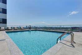 Immeuble avec piscine, salle de sport, terrasse extérieure avec aire de BBQ, sécurité et concierge.