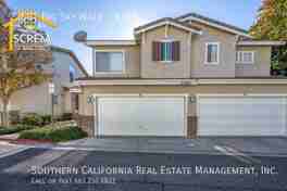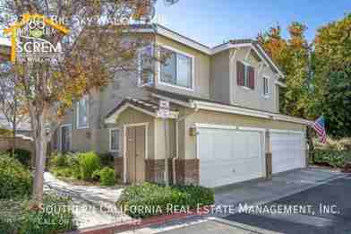 This beautiful three-bedroom townhouse is situated in the desirable Montana community in Valencia. Upon entering, you'll be greeted by an open floor plan. The living room boasts vaulted ceilings, carpet flooring, and a double-sided fireplace. Adjacent to the living room is the dining area, which includes a ceiling fan and leads into the kitchen. The kitchen is equipped with tile countertops, recessed lighting, a gas stove, a single oven, a microwave, a dishwasher, and a refrigerator. Next to the kitchen is the family room, which features a built-in entertainment niche, fireplace, carpet flooring, and a sliding glass door that opens to the private covered patio. The patio has a ceiling fan and a utility sink, perfect for outdoor gatherings. Additionally, there is a half bathroom located downstairs for guests. The spacious primary bedroom includes a vaulted ceiling, a ceiling fan, carpet flooring, a walk-in closet, and an attached bathroom with dual sinks and a walk-in shower. The two guest bedrooms also have ceiling fans, mirrored closet doors, and carpet flooring. The property features a full guest bathroom and an attached two-car garage that includes a full-size washer and dryer. Residents can enjoy the HOA amenities including a pool and spa. *The owner may consider a small pet.