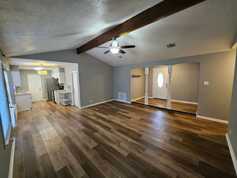 This quaint 3 bedroom, 2 bathroom brick home offers 1,460 square feet of cozy living space in Leesville, just a short drive to Fort Polk. The layout is practical and easy to enjoy, with a spacious living room featuring a vaulted ceiling with a wood beam and durable wood-style vinyl flooring throughout the main areas.