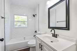 One side of the home includes two bedrooms and a full bathroom highlighted by a beautifully tiled shower. On the opposite side, you’ll find a functional galley kitchen complete with white cabinetry and granite countertops and equipped with a stove, dishwasher, microwave, and refrigerator.