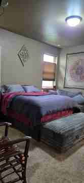 This offer is available beginning April 30th and will expire July 30th, 2026. Fully furnished master suite available for rent, $750 per month and utilities are all included. That equals $25.00 per night to stay in a relaxing and comfortable environment. Must be ok with light house sitting duties in a fully furnished home. Garden upkeep is essential in this offer. The house has a fenced backyard and is surrounded by mostly established raised bed gardens that will need occasional attention. Master Bedroom is fully furnished with a queen size memory foam bed, walk-in closet with extra storage space, double sink bathroom with granite counters and a tiled double walk-in shower. For added comfort there is a memory foam love-seat and easy viewing of TV with Roku access. This room is also secure with a key-lock door. Amenities of this rental include access fully stocked kitchen, refrigerator, freezer, and pantry space, gas range and oven, dishwasher, and all of the fun cooking essentials you will need. The laundry room features up-graded appliances, and additional small storage space.
