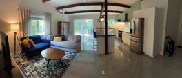 This modern unit features a spacious, open kitchen with a large island, stainless steel appliances, and a built-in dishwasher. There's plenty of space for a large dining room table, making it perfect for entertaining. The bathroom includes a full bathtub, and you'll love the private patio at the back of the unit—ideal for outdoor relaxation.