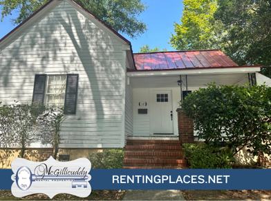 On the edge of Historic Summerville sits a beautiful 2 bedroom/1 bath white house that has been lovingly restored. Hardwood floors flow throughout the home with an open living room/kitchen concept complete with a dining area and an eat-in bar. Although the fireplace is only for show, it has a beautiful mantle and built-in cubbies on either side of the centerpiece. If you don't find enough storage inside the house, there is a floored attic and a large stick-built shed in the backyard. Trees cover the driveway that winds to the back of the property and shade the house year-round. If you like to watch the neighborhood, there's a cute little porch on the front just big enough for a comfy bench. However, if you prefer privacy, the driveway leads to a fenced back yard and a deck where you can enjoy shaded outdoor time all year round. Yard maintenance and trash service are complimentary with this rental.