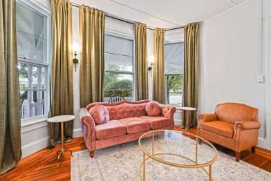 This gorgeously restored first floor 2bed/1bath, 900ft² apartment is overflowing with totally renovated historic character and charm, designed and curated with optimal comfort, character, relaxation and home away from home conveniences in mind. Starring large windows, high ceilings, warm tones and thoughtful living spaces this Saratoga Stay by Green Springs is immediately welcoming. We have carefully outfitted the space with all of the accommodations you'll want or need for relaxing, cooking, dining, sleeping, bathing, web surfing, conversing and working. Positioned in the heart of downtown, walkable to downtown or the Saratoga Race Course, this location, easily accessible to the best Saratoga has to offer, can't be beat. •Laundry -shared/on site •Fully outfitted kitchen •Towels/linens provided •Shared furnished front porch •Work from home accommodations •Coffee, groceries, movies, dining a few short blocks. •NONsmokers Strictly! •3 person Occupancy max Lease Lengths Available: 6, 9 or 12 months ANIMALS: Animal friendly - max 2 ≤50lb total animals weight limit NEIGHBORHOOD: This property is ideally positioned between a quiet neighborhood on the backside and the invigorating bustle of Saratoga from the front. Mere blocks of easy walking to either Saratoga's race course or downtown Broadway's shopping, dining, parks and nightlife. Just down the sidewalk from the parking lot finds you up a few steps to a private entry on the right side of a large shared front porch. Right in the entry way drops you into the kitchen. Through the kitchen is a wide hallway with open shelving great for dropping purse, keys, pocket contents and a large closet great for shoes and coats. At the front end of the hall is a living/dining space with plentiful seating and wow factor windows and window treatments. At the back end of the hall are the two bedrooms/office space and the master bath. BEDROOMS: For sleeping there are two bedrooms. A spacious master is complete with a four poster King bed, arm chair, large bright walk in closet and a gorgeous full length stylish mirror to make getting ready a breeze. A smaller bedroom comfortably fits a Twin day bed and a desk right by two windows, perfect for work days. Each bed is outfitted with plentiful pillows and warm cozy seasonal layers. KITCHEN/ DINING: For meal time there is a round dining table complete with place settings in the shared living/dining area. The kitchen is stocked with plentiful bakeware and cookware as well as a shared outdoor grill for a wide variety of culinary prep wants and needs. BATHROOM: For bathing there is a beautiful newly renovated subway tile surround full tub/shower bath stocked with beauty care basics and plentiful bath linens. **Note: there is 1 bathroom and it is accessible via the Master bedroom OUTDOORS: For outdoor enjoyment there is a furnished front porch for relaxing and a grill off the back porch for use in our shared outdoor space. ACCESS: This is a multi unit property. Each individual apartment has its own private secure entry. The entire unit is yours and in no way accessible to any other building occupants. PARKING: 1 off-street parking space Free on-street parking. UTILITIES: Flat $295/Month fee ONE TIIME FEES: $250 cleaning fee $95 Move In