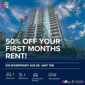 Modern 2 Beds, 2 Baths Apartment/Condo | 2 Pets Allowed. 20lbs Max | 50% Off First Month if move-in by Dec 1/25Welcome to your new home at 519 Riverfront Ave SE- Unit 708 - 708 — a modern and well-maintained 2 beds / 2 baths / Apartment/Condo offering comfort, space, and convenience. Ideally located close to shopping, schools, parks, and transit. \_\_\_\_\_\_\_\_\_\_\_\_\_\_\_\_\_\_\_\_\_\_\_\_\_\_\_\_\_\_\_\_\_\_\_\_\_\_\_\_\_\_\_\_\_\_\_\_\_\_\_\_\_\_\_\_\_\_\_\_\_SHOWINGS: Conducted in an open-house format — book your appointment today! https showmojo com 79c3e9f0b2 lPrices, availability, and promotions are subject to change without notice. VIDEO TOUR: https youtu be FwrMOiRWvqU 3D TOUR: http ehosting411 com RTM 20210214\_T2G0H1 VRT \_\_\_\_\_\_\_\_\_\_\_\_\_\_\_\_\_\_\_\_\_\_\_\_\_\_\_\_\_\_\_\_\_\_\_\_\_\_\_\_\_\_\_\_\_\_\_\_\_\_\_\_\_\_\_\_\_\_\_\_\_PROPERTY DETAILS: - Furnished or Unfurnished: - Pets: 2 Pets Allowed. 20lbs Max - Smoking: Non- Smoking - Parking: Underground - Storage Included: Yes - Laundry: In- Suite Laundry - Management Type: Full Management - Lease Term: Long Term \_\_\_\_\_\_\_\_\_\_\_\_\_\_\_\_\_\_\_\_\_\_\_\_\_\_\_\_\_\_\_\_\_\_\_\_\_\_\_\_\_\_\_\_\_\_\_\_\_\_\_\_\_\_\_\_\_\_\_\_\_UNIT FEATURES: - Living Space:Open-concept living room layout, perfect for relaxing or entertaining - Kitchen: Sleek and modern kitchen with all appliances for a contemporary look with plenty cabinet storage to keep everything organized - Dining Space: Open-concept design flowing into the living space, perfect for entertaining - Bedrooms: 2 Bedrooms featuring ample storage for clothing and accessories - Window Coverings: Includes window coverings for privacy and light control \_\_\_\_\_\_\_\_\_\_\_\_\_\_\_\_\_\_\_\_\_\_\_\_\_\_\_\_\_\_\_\_\_\_\_\_\_\_\_\_\_\_\_\_\_\_\_\_\_\_\_\_\_\_\_\_\_\_\_\_UTILITIES: - Utilities Included: Heat,WaterHere's a helpful tool you can use to get a rough estimate of utility costs. Just check out the link: https ucahelps alberta ca cost-comparison-tool \_\_\_\_\_\_\_\_\_\_\_\_\_\_\_\_\_\_\_\_\_\_\_\_\_\_\_\_\_\_\_\_\_\_\_\_\_\_\_\_\_\_\_\_\_\_\_\_\_\_\_\_\_\_\_\_\_\_\_\_\_LOCATION HIGHLIGHTS: - Outdoor Living: Nearby Parks, Pathways, Greenspaces - Transit & Access: Transit Lines / Major Roads Nearby - Family Friendly: Close to Schools, Childcare, Rec Centres - Local Conveniences: Groceries, Shops, Restaurants, Services Nearby Don't wait — properties like this don't last long. Book online today: https showmojo com 79c3e9f0b2 l