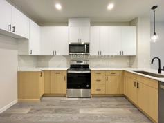 This spacious 1,548-square-foot townhouse offers a bright and welcoming living environment with hardwood floors, high/vaulted ceilings, and neutral-painted walls accented by crisp white trim. The large windows and strategically placed lighting fixtures flood the home with natural light, making the space feel airy and open. The living area flows seamlessly into the kitchen, featuring a sleek quartz countertop, stainless steel appliances, and an L-shaped layout designed for both functionality and style.