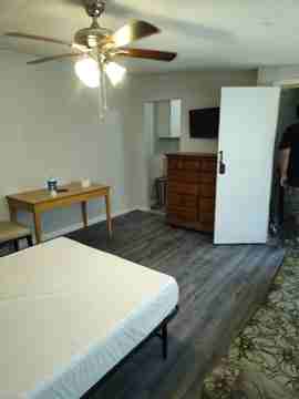 This is a furnished one bedroom, one bath studio which includes a full-size gel bed, TV with all channels on the wall, a dresser, ceiling fan, kitchenette with cabinets, microwave, refrigerator, two burner stove, sink, and a washer/dryer, full bathroom with shower, vanity/sink and toilet. This unit is about 12'x24'. utilities are included which are electric, wifi, water, trash pickup, lawn maintenance. The rent is $1000/month with first, last and security deposit required to move in. Must have no recent criminal/eviction history and have stable income.