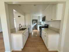 - Updated galley-style kitchen with quartz countertops, stainless steel appliances & white shaker cabinets