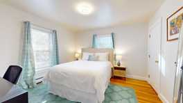 Located on the second floor, this bright and inviting home features modern gray plank flooring and a spacious bedroom with a queen-sized bed and a large desk—perfect for working from home.