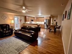 This fully furnished 1-bedroom, 1-bathroom duplex with a heated 1-car garage, offers comfort and convenience. The spacious kitchen features bar seating, perfect for entertaining. The bedroom boasts true blackout shades for restful sleep year-round and includes a walk-in closet with built-in shelves to provide ample storage.