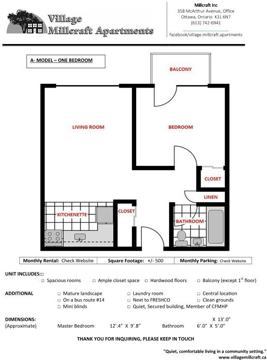 Welcome to Village Millcraft Apartments!We have 2 Different Models of 1 Bedrooms Available for Immediate Occupancy (Check out the pictures for the different floor plans) *ASK ABOUT OUR MOVE IN BONUS*!!Model A - Kitchenette Model $1475.00 + Hydro (1st 10 Photos are of the Model A)We also have larger 1 bedroomsModel B - Large 1 Bedroom + Den STARTING at $1545.00 (2nd 11 photos are of the Model B + Den)** We also have a Model B - Large 1 Bedroom with a Newly Renovated Bathroom $ 1575.00 + Hydro*Outdoor parking is available for $50.00 a month. All 2nd and 3rd floor units have balconies. If interested, please contact the rental office for additional information, and to book an onsite viewing. Village Millcraft Apartments is a community of 18 classic low-rise third-floor walk up rental buildings running down two low-traffic, residence-only roads. The property is accentuated with gorgeous large trees and beautifully maintained gardens. At Village Millcraft Apartments, you will experience a private park-like setting that combines the quiet and clean comfort of community life with the convenience and amenities of living in the heart of Ottawa. Village Millcraft is 271 one and two bedroom apartments: all of our spacious suites feature either an eat-in kitchen or a kitchenette with ceramic tile flooring, living spaces complemented by warm hardwood floors, and all newly renovated windows and balconies. All our buildings offer on-site laundry facilities, security key and intercom access only and pet friendly units. Please check out our website: ******** additional information and a virtual tour of the units available!
