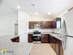 Step inside to enjoy an open-concept floor plan with luxury wood-look vinyl plank flooring flowing seamlessly throughout. The gourmet kitchen is a true highlight, featuring granite countertops, brand-new stainless steel appliances, ample cabinet space, and a breakfast bar-making it ideal for everyday living and entertaining.