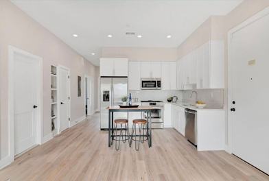 • L-shaped spacious kitchen with plenty of cabinet storage and stainless steel appliances