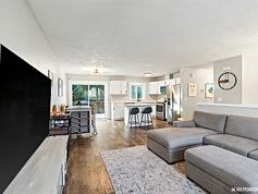 The main level features a bright open-concept layout with large windows, modern flooring, and excellent natural light. The fully updated kitchen includes white shaker cabinets, quartz countertops, stainless steel appliances, a large island with storage, and plenty of workspace perfect for cooking and entertaining. The dining area opens to a private deck overlooking the fully fenced backyard.