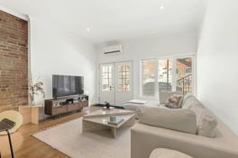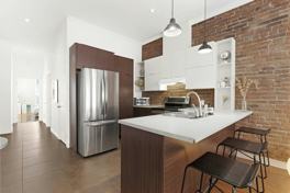 * High ceilings and exposed brick wall for a spacious, modern feel