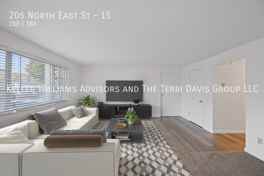 This charming 2-bed, 1-bath unit features a blend of hardwood and carpet floors throughout, complemented by ceiling fans for comfort. The modern kitchen offers granite countertops, hardwood cabinets, a full suite of appliances including a stove/oven, dishwasher, and refrigerator, along with elegant tile flooring.