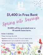 $1,400.00 in Free Rent prorated over 14 months as a monthly rent reduction with Lease start date by April 30, 2026