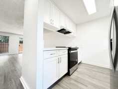 A recently refreshed 3-bedroom, 1 1/2-bathroom townhouse has a full kitchen with stainless steel appliances, easy to clean vinyl plank flooring, enclosed courtyard, and two assigned parking spaces.
