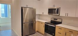 The kitchen boasts sleek white cabinets, matte black accents, and stylish finishes.