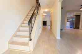 Wall-to-wall hardwood floors in common areas; carpeted bedrooms and tiled bathrooms