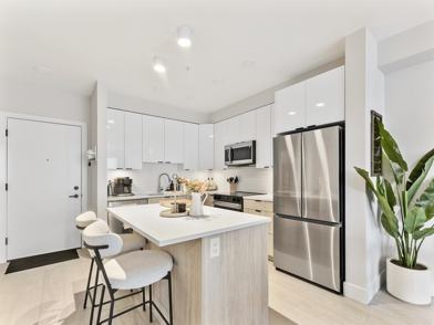 Kitchen: Modern design with quartz stone countertops, stainless steel appliances (including fridge with water and ice, ultra-quiet dishwasher, glass flattop stove, and microwave/hood fan combo), and polished chrome fixtures.