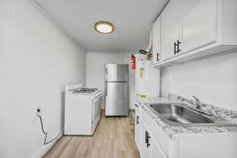 The kitchen is a culinary dream with crisp white cabinets and granite counters, an electric stove range, and a fridge, all complemented by chic black accents. You'll appreciate the convenience of stackable washer-dryer connections right in your unit.