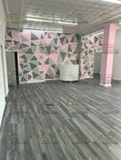 This commercial space is approximately 1,100 square feet, features a modern and stylish interior with a pink, gray, and white color scheme. The flooring is dark gray wood-style laminate, providing a sleek and professional look.
